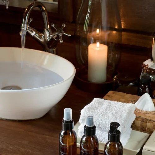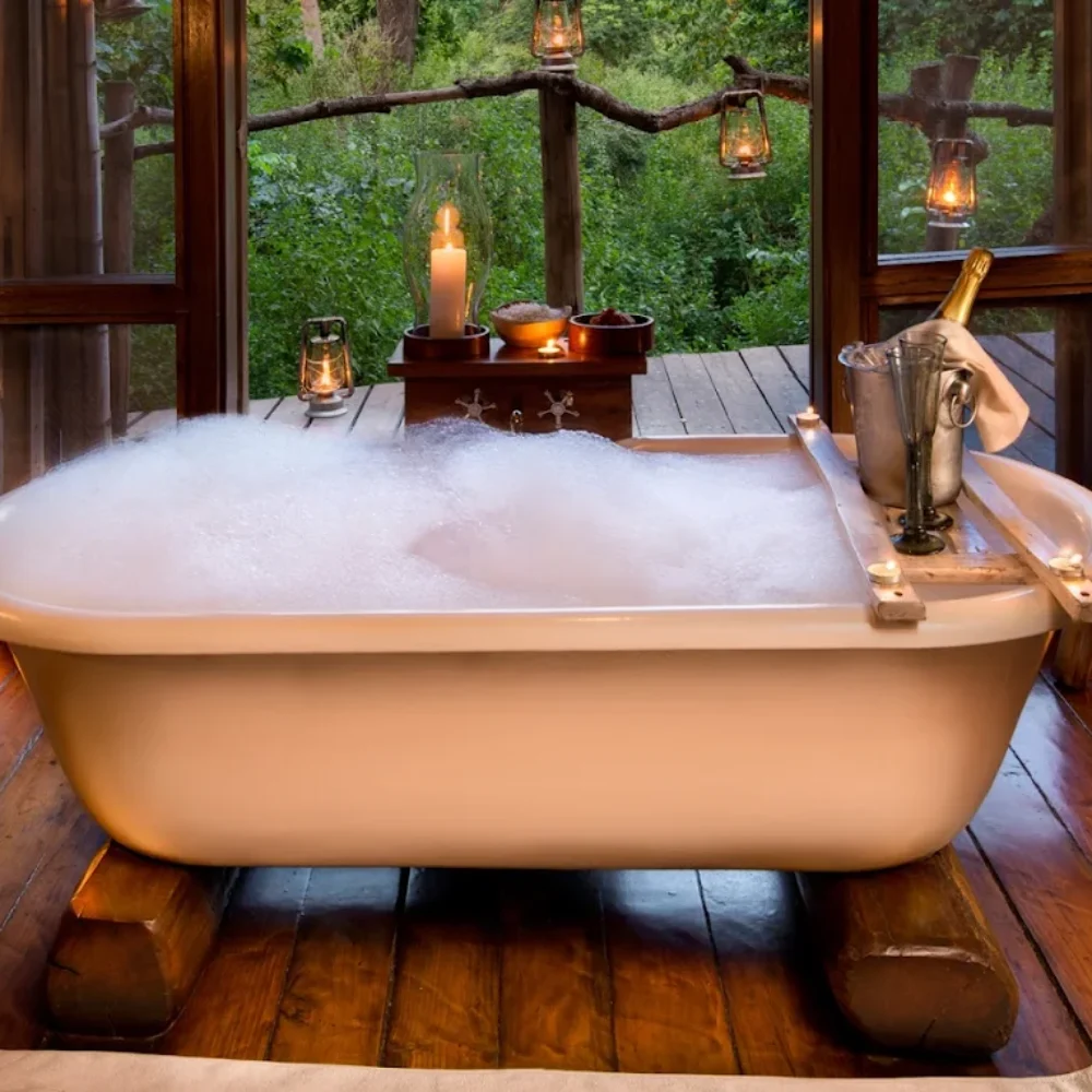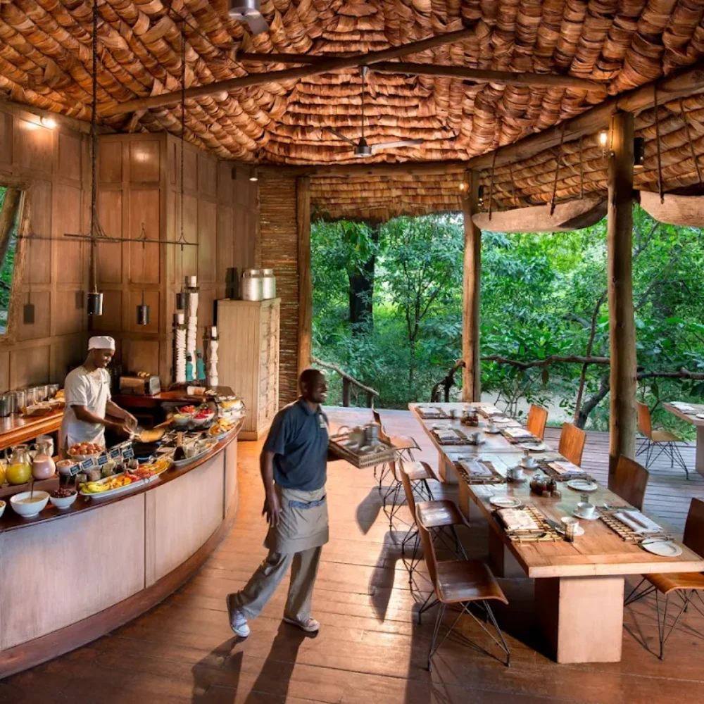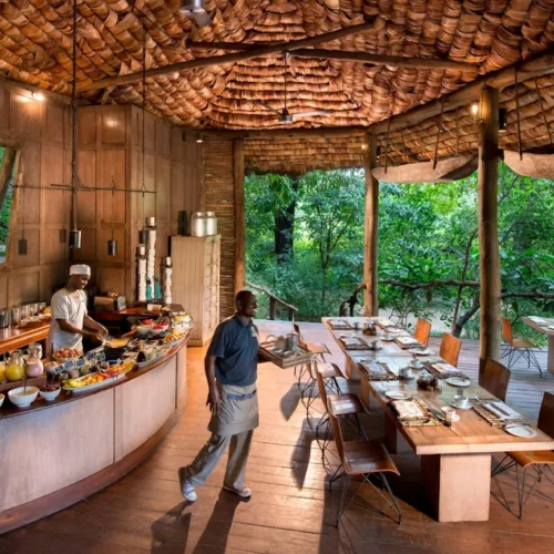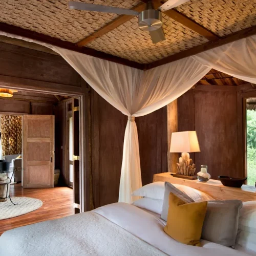 The lodge features 10 elegant stilted treehouse suites raised above the forest floor. Each suite is crafted from timber and makuti palm, featuring large decks, en-suite bathrooms with free-standing bathtubs, outdoor showers, king-sized beds with mosquito nets, and thoughtful touches that highlight sustainable luxury. The shaded forest setting creates an immersive and peaceful experience.