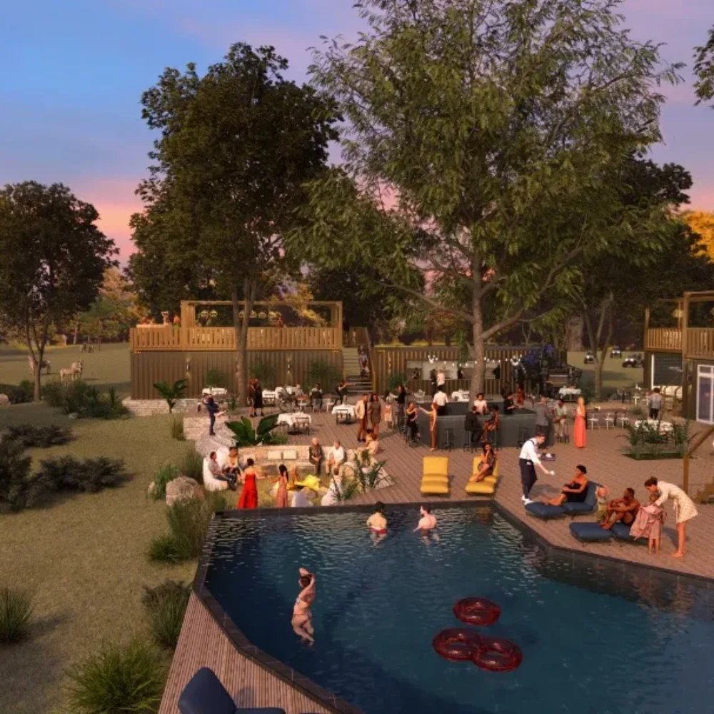 The lodge features innovative “SoulBoxes”—repurposed shipping containers transformed into stylish, eco-friendly suites. Each unit is designed to harmonize with the natural surroundings while providing modern comforts.