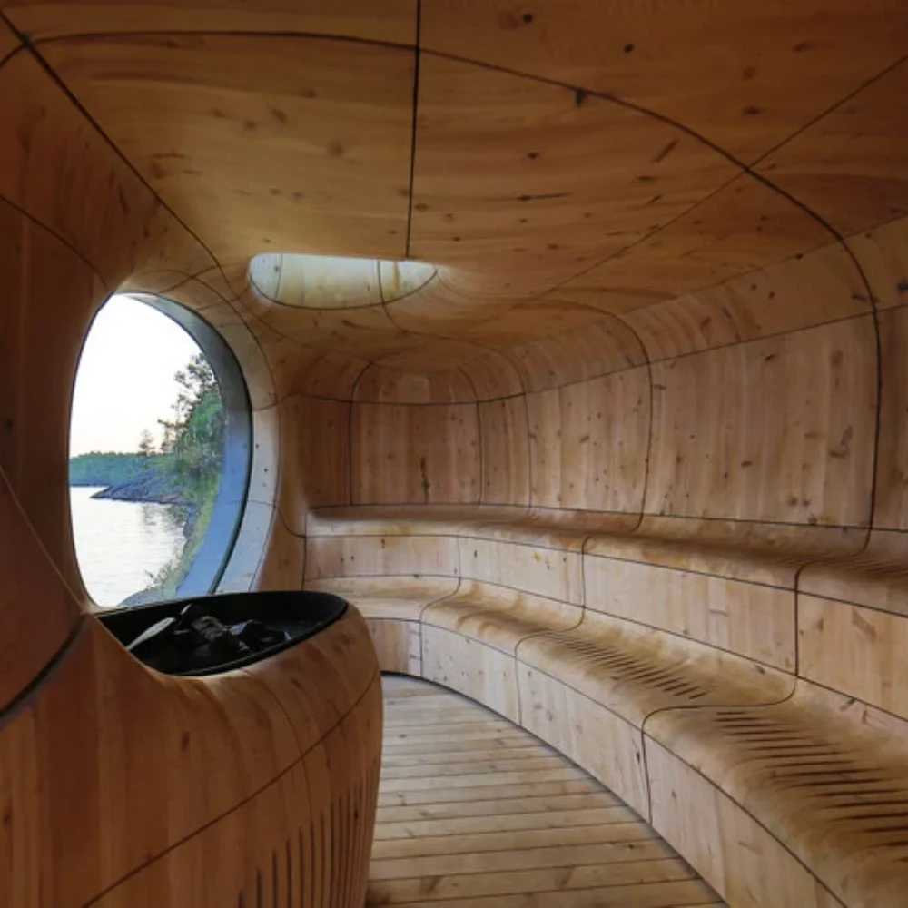 Utilizes repurposed shipping containers and recycled materials for decking.