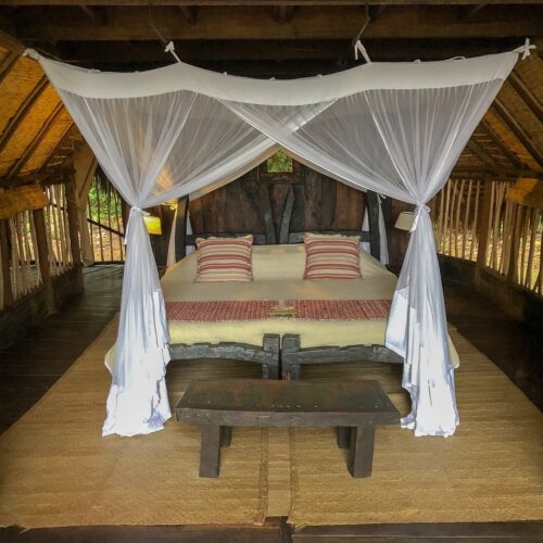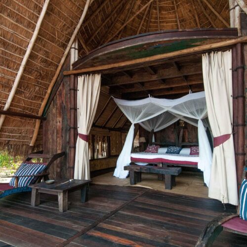 Greystoke Mahale’s six thatched bandas are crafted from reclaimed dhow wood and nestled at the forest’s edge, each open-fronted with sweeping lake views. The rooms feature king-size beds, open-air bathrooms, and upstairs chill-out decks, creating a blend of rustic charm and refined comfort. The design allows guests to feel immersed in nature without compromising privacy or style.
