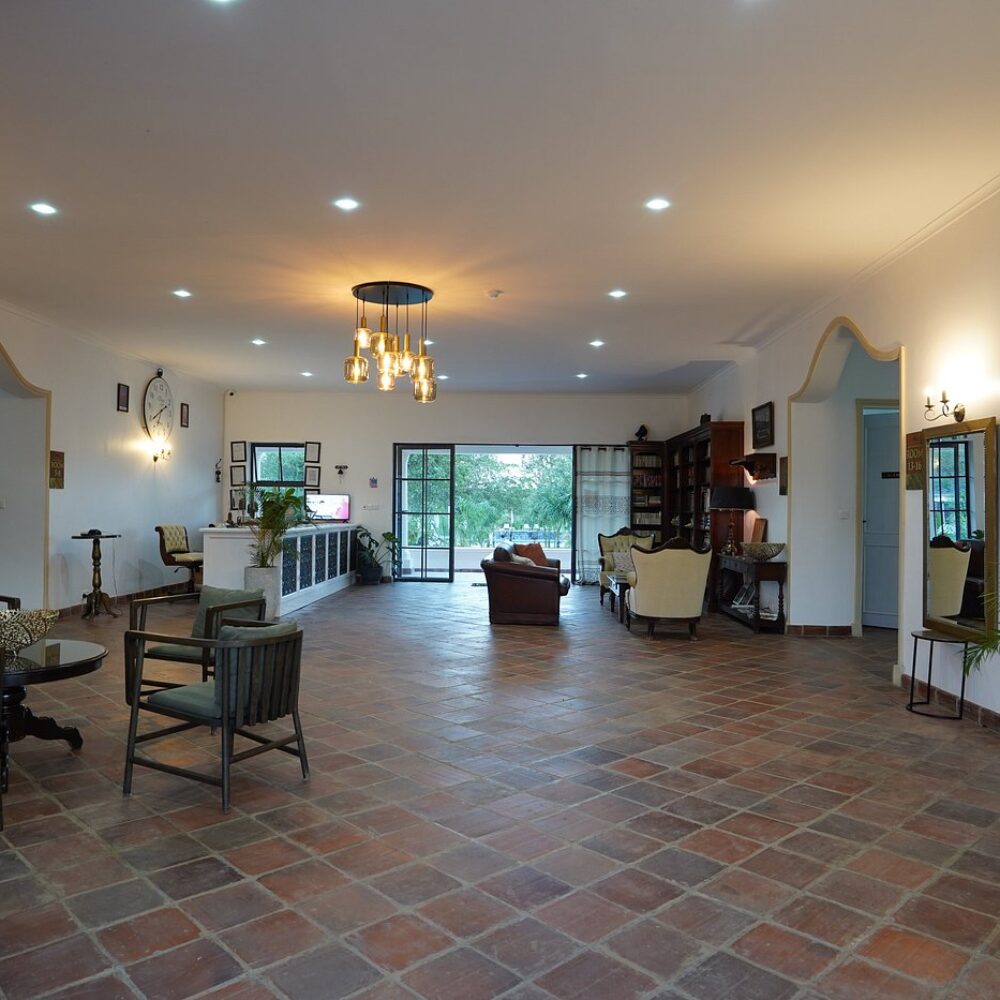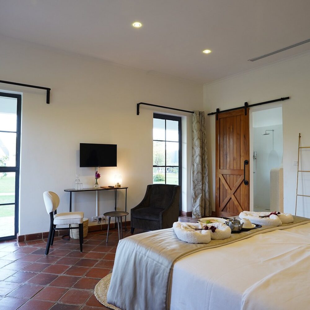 The lodge features 14 spacious suites set in landscaped gardens with beautiful views of Mount Meru. Each suite includes a large bedroom with seating area, private veranda, and an en-suite bathroom with rain shower. Designed with a blend of modern touches and natural materials, the interiors are warm, earthy, and relaxing.