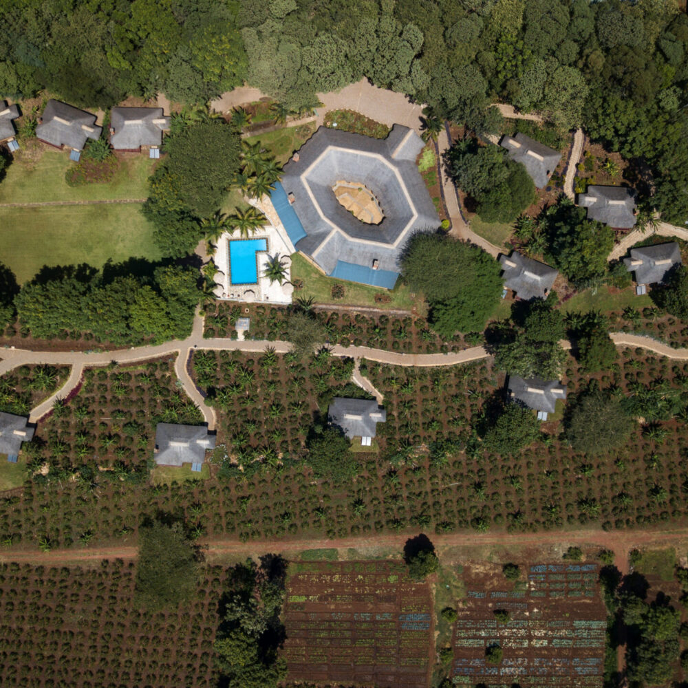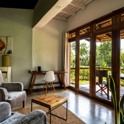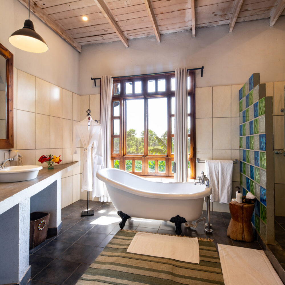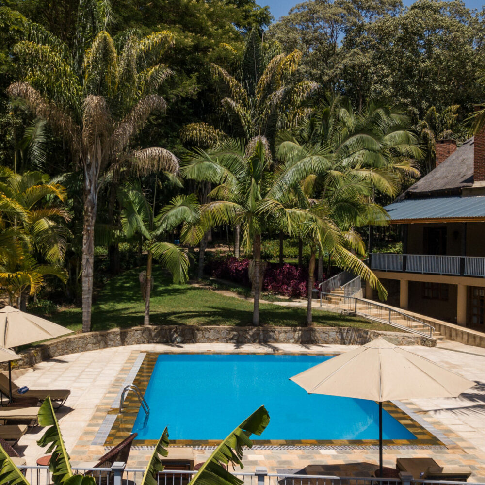 Kitela Lodge features 20 spacious chalet-style rooms, beautifully appointed with canopied beds, stylish wooden furnishings, and private verandas. Each room is designed for comfort, offering views of the gardens or coffee plantation.