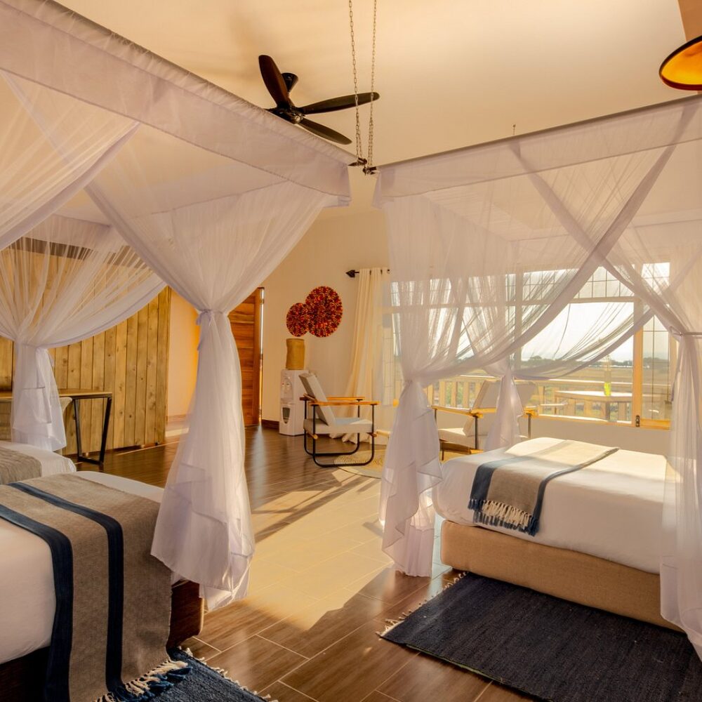 From the elevated lounge and restaurant, you can soak in panoramic views of the lake and Rift Valley escarpment — and if you’re lucky, spot elephants, impalas, or even lions passing through the open savannah.