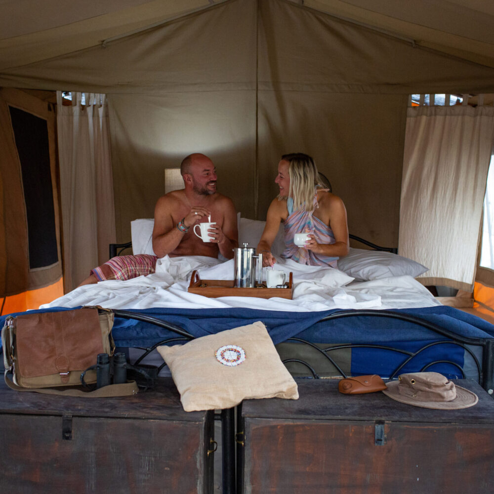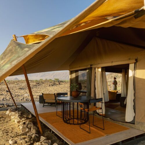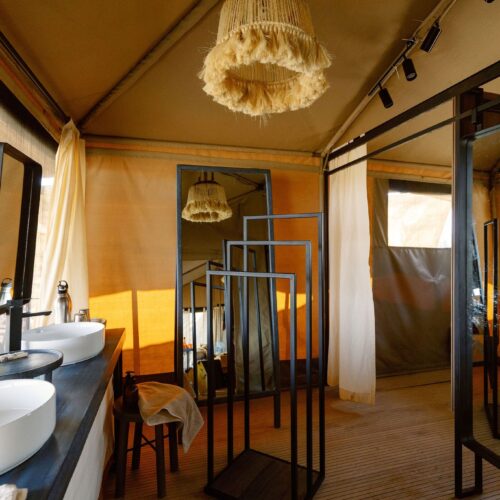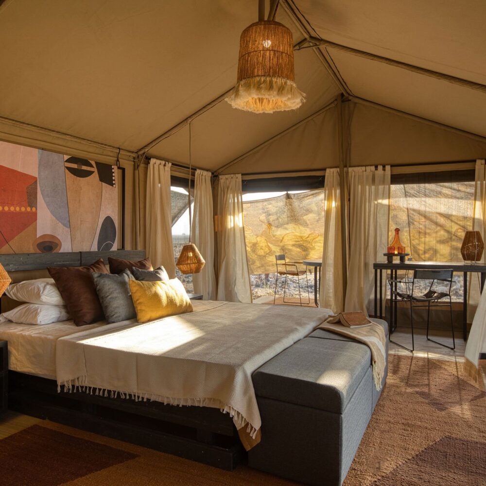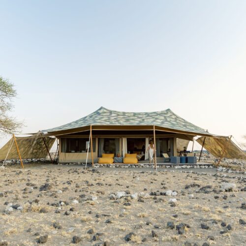 The camp offers 10 comfortable and spacious canvas tents, each designed to blend seamlessly with the surroundings. Tents feature en-suite eco-bathrooms with safari showers and flushing toilets, comfortable beds, solar lighting, and private verandas that open to expansive views of the lake, mountains, and open plains.
