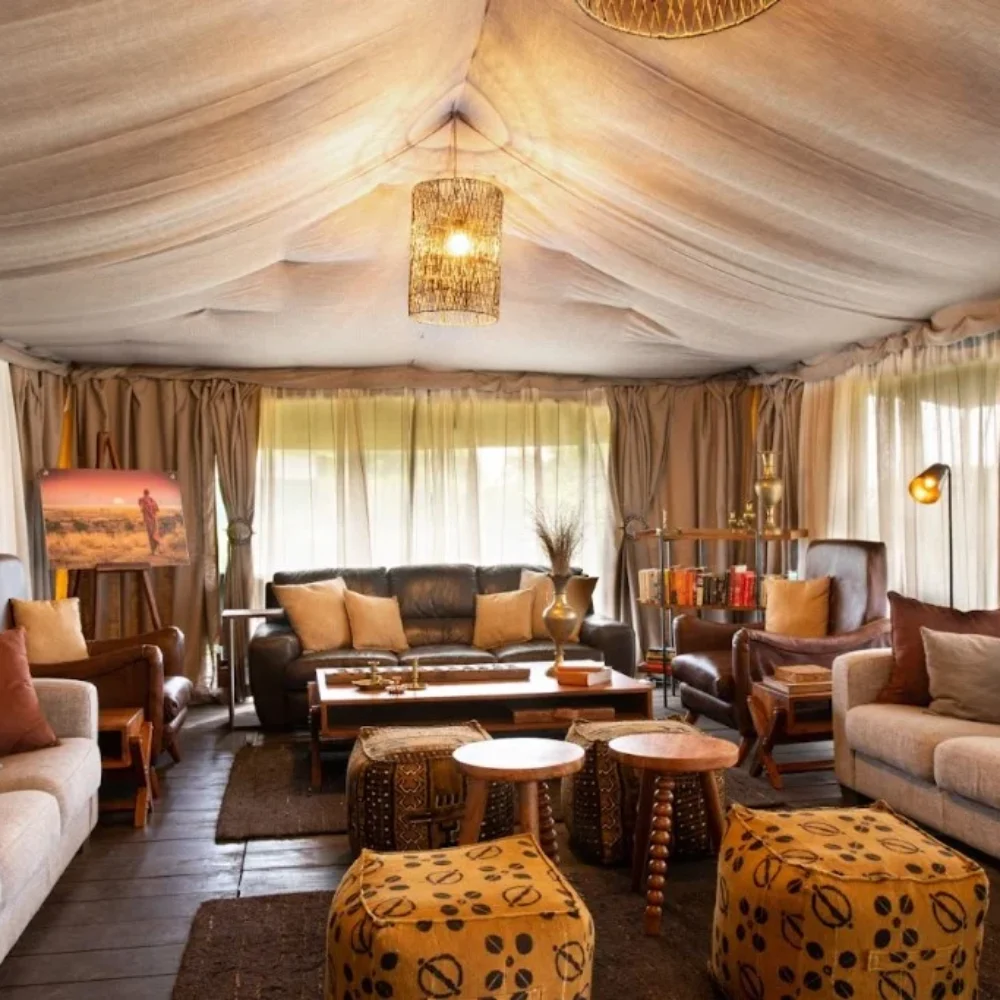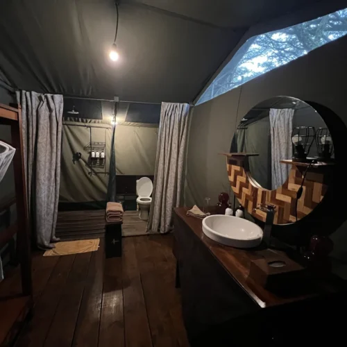 The camp features 9 spacious canvas tents, including 1 family unit. Each tent is tastefully furnished with wooden beds, warm duvets, rugs, en-suite bathrooms, and hot water bucket showers. Cozy gas heaters are provided for chilly highland nights.