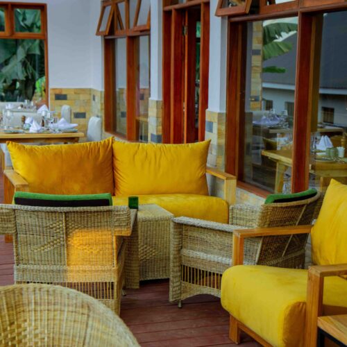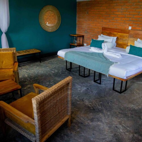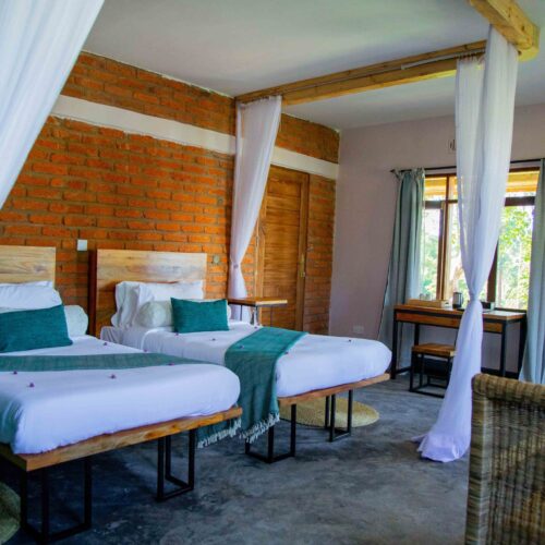 The lodge features comfortable bungalow-style rooms, each equipped with en-suite bathrooms, mosquito-netted beds, and private verandas. Earth-toned decor, handmade furniture, and simple luxury reflect local character and charm.