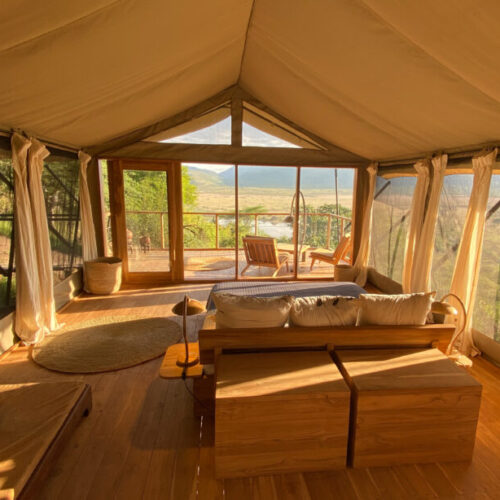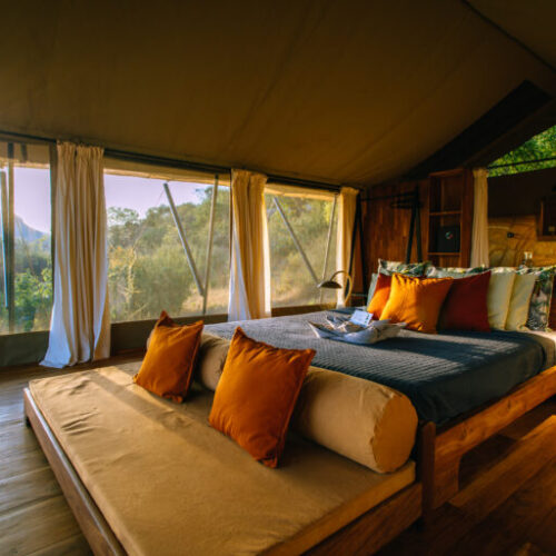The retreat features just a handful of beautifully appointed tents, spaced widely apart for maximum privacy. Each suite blends canvas and stone with a natural color palette, offering king-size beds, en-suite bathrooms, private decks, and sweeping views of the savannah below. Thoughtful design ensures harmony with nature while delivering discreet luxury.