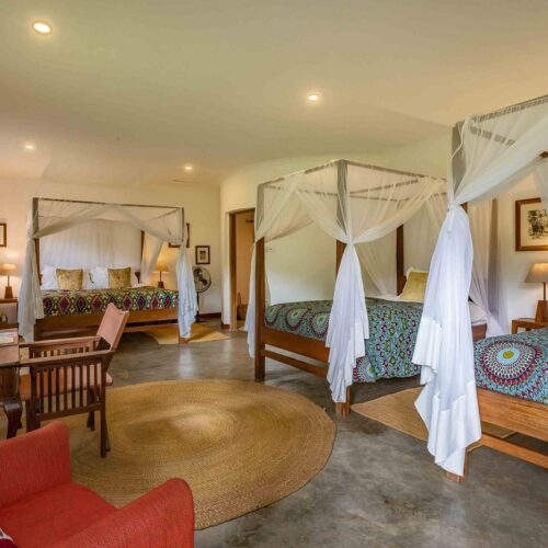 The lodge features 17 guest rooms, including single, double, twin, triple, and family configurations. Each room is thoughtfully decorated, featuring mosquito-netted beds, writing desks, and private verandas overlooking the lush gardens or sanctuary.