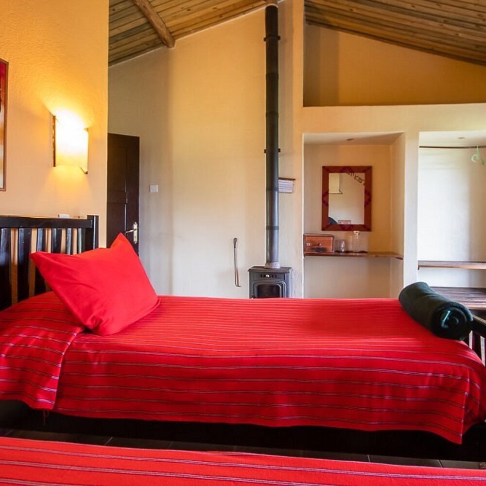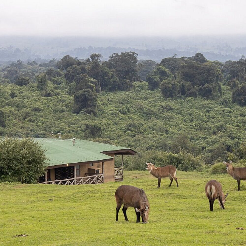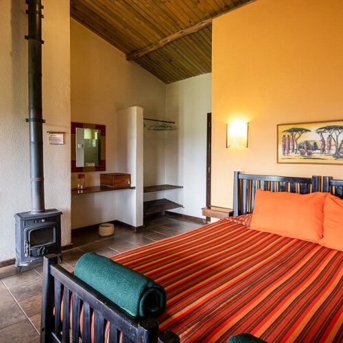 The lodge has 24 en-suite rooms, each with a private veranda facing the forest or crater edge. Rooms feature comfortable beds, hot water showers, and wood-burning stoves to keep guests warm during the chilly highland nights.