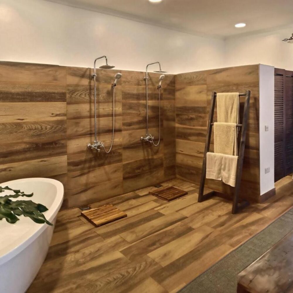 Each room is elegantly styled with an Afro‑fusion aesthetic—high ceilings, hardwood finishes, mosquito nets, generous verandas, and stunning Mount Meru views. Rooms include en-suite bathrooms (shower and/or tub), hairdryer, safe, toiletries, and bottled water.