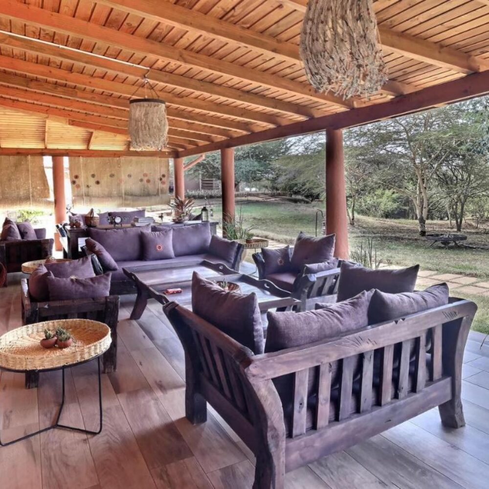 Sundowner area with fire pit and verandah seating overlooking gardens and Mt Meru.