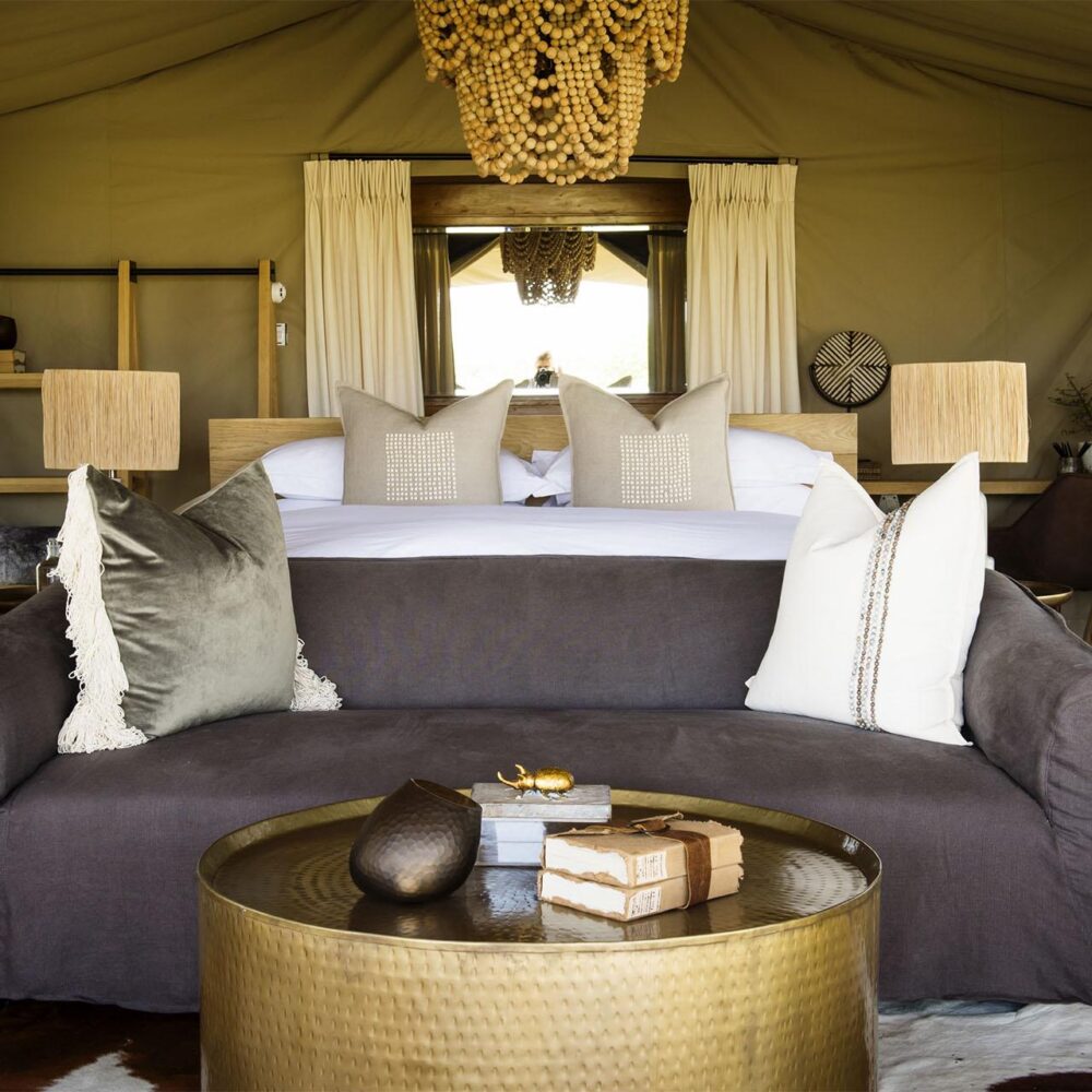 The camp consists of 8 luxury canvas tents and 1 two-bedroom family tent, all set on raised wooden decks with en-suite bathrooms, hot showers, flushing toilets, and private verandas. Interiors are tastefully furnished with contemporary African décor, offering comfort and style in the wilderness.