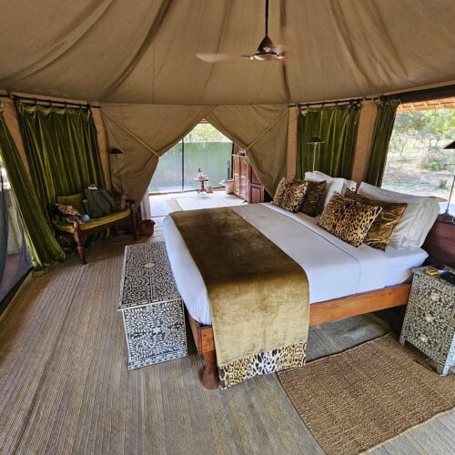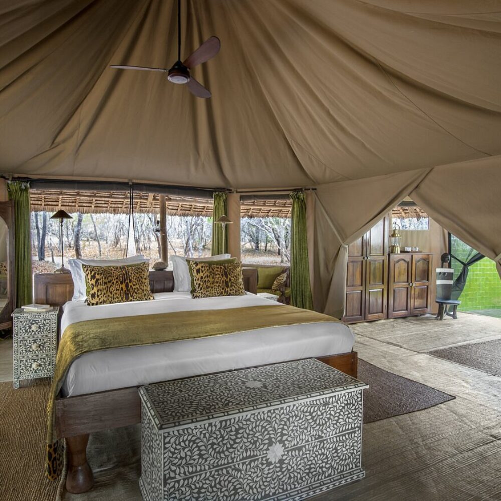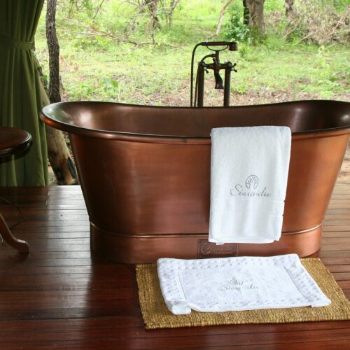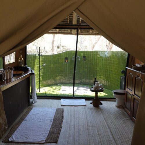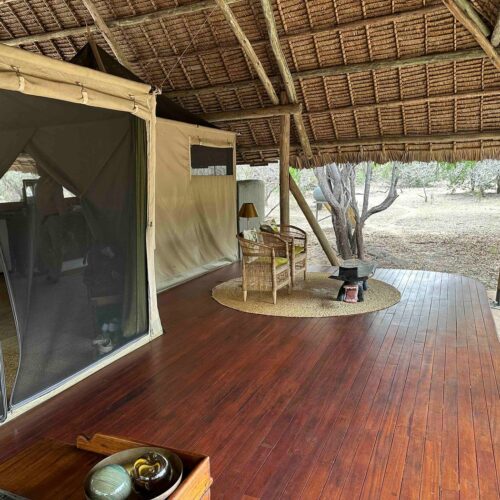 Siwandu features 13 spacious canvas tents on raised wooden platforms, each with en-suite bathrooms, open-air solar-heated showers, and large verandas offering panoramic views over the lake or surrounding bush. The tents are thoughtfully spaced for privacy and connected by sandy paths under towering palms.