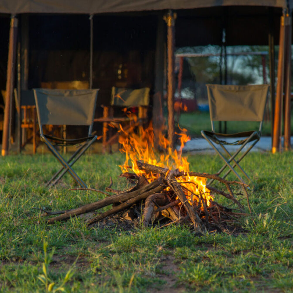 The camp features 10 spacious en-suite tents, each with safari-style furnishings, comfortable beds, and attached bathrooms with bucket showers. The tents are spaced for privacy and offer direct views over the savannah.