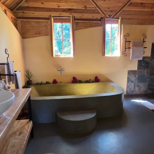 Main House Rooms: Three rustic yet spacious rooms, each with private garden access. All come with en‑suite bathrooms, walk‑in showers, large bathtubs, and separate toilets.